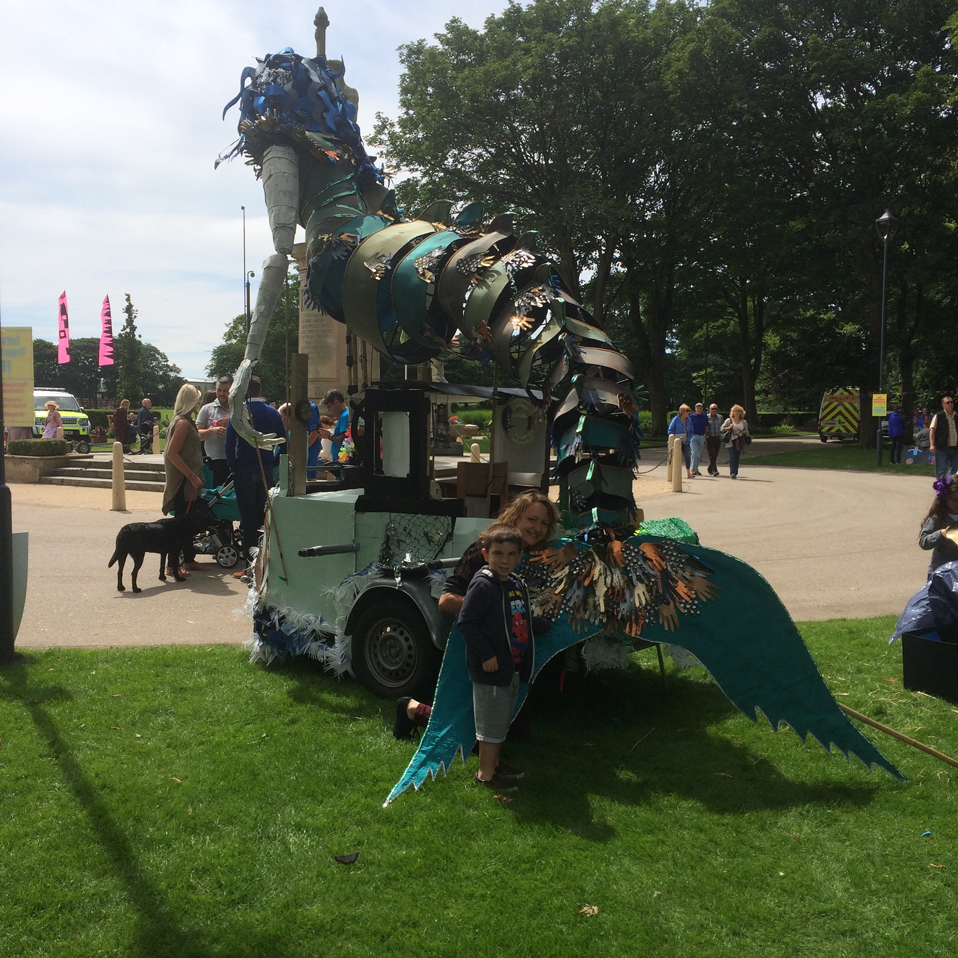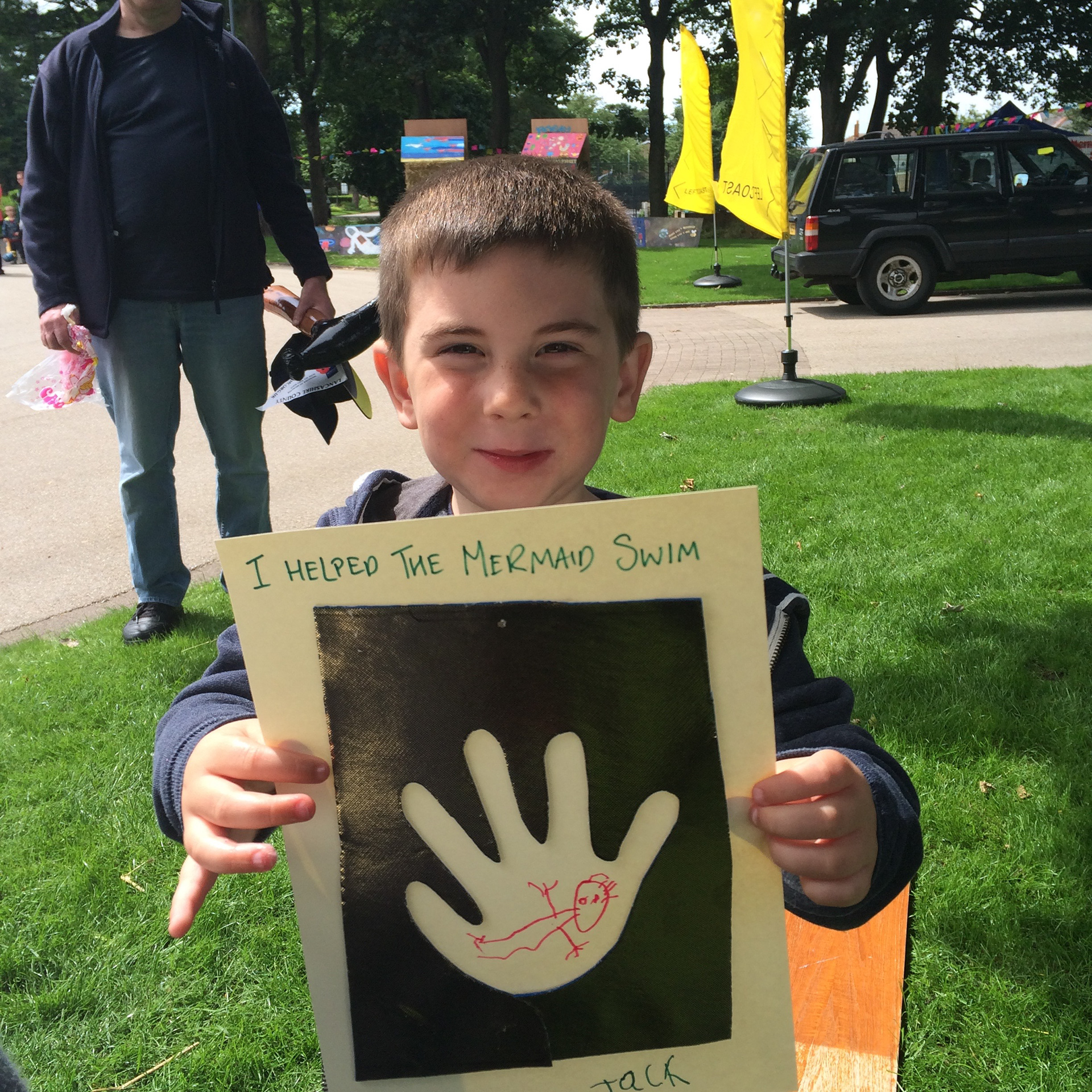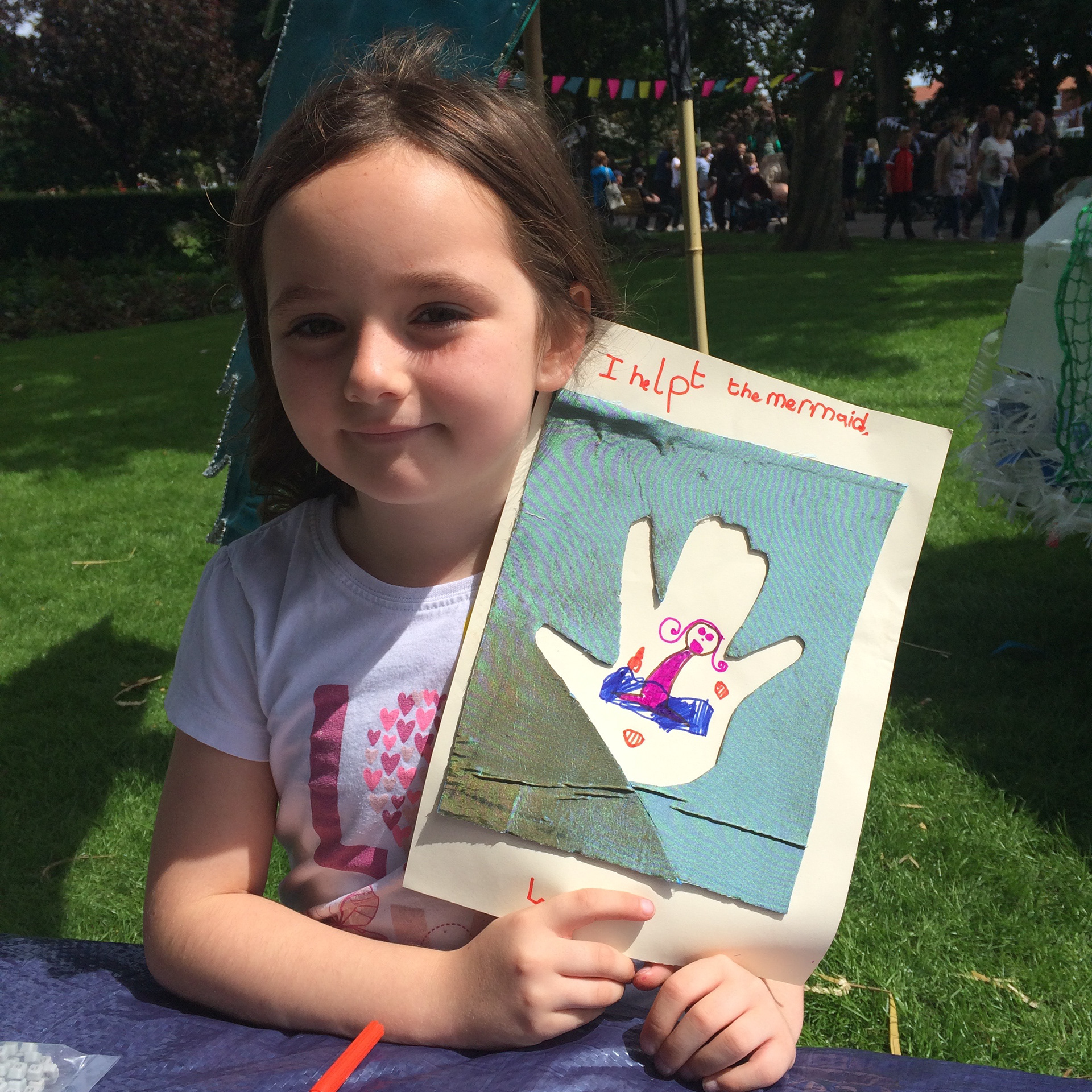 We also offer craft workshops. Local kids can help our mermaid swim, by creating scales for her based on their handprints. We utilise all the leftover materials to make some art to take home too!
